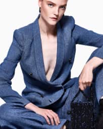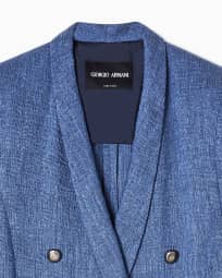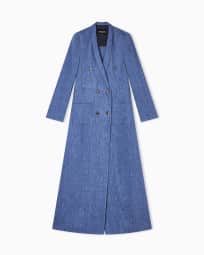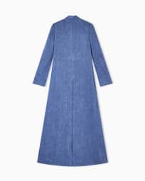 Long double-breasted coat in faded linen, viscose and silk crêpe.