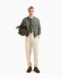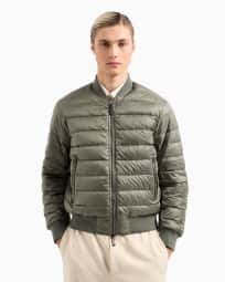 Reversible down jacket with a bomber jacket collar in jacquard nylon with all-over lettering
