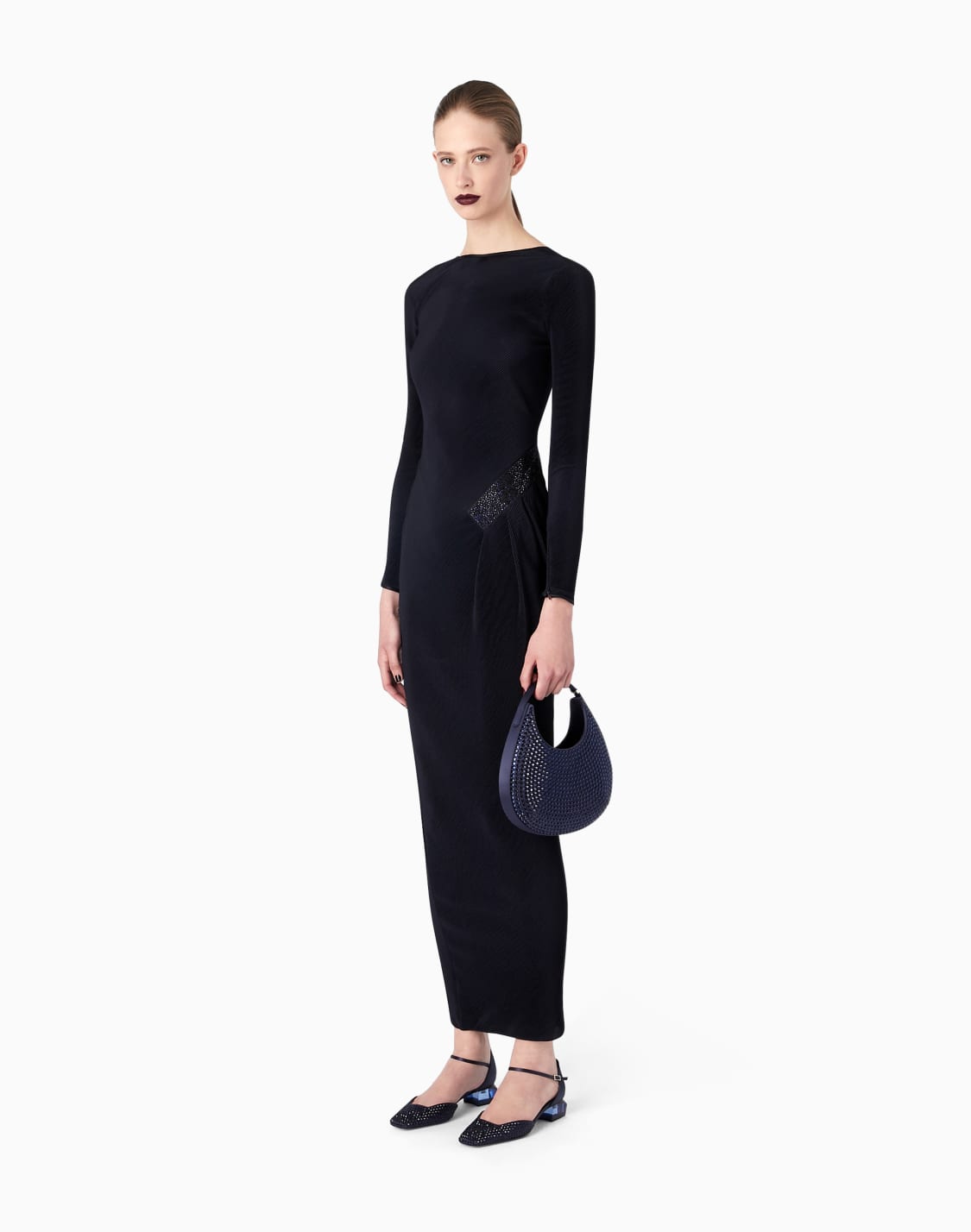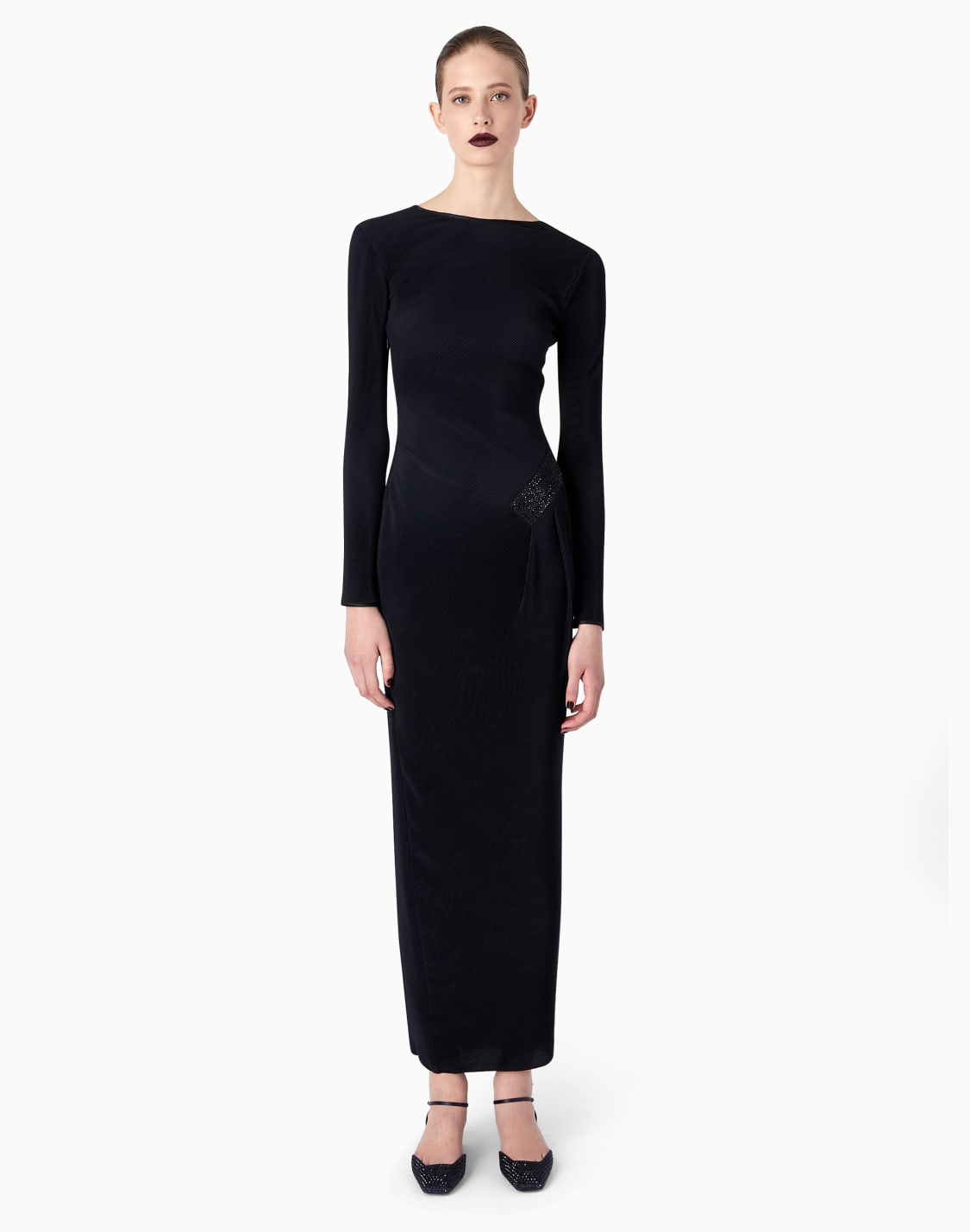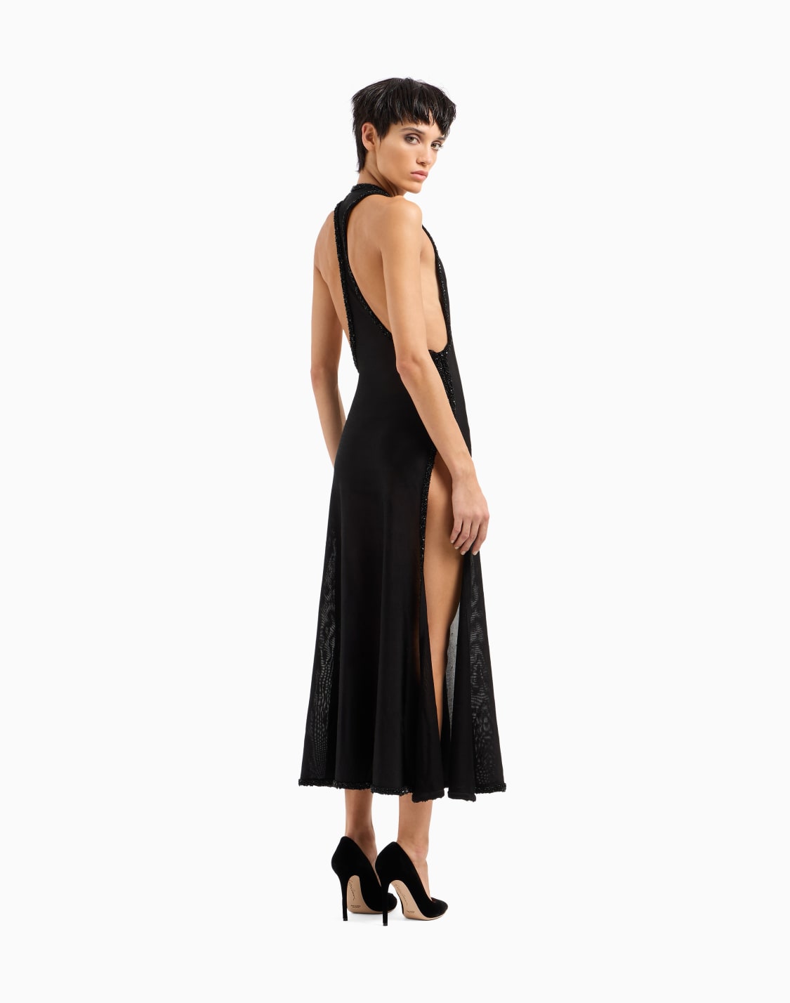 Gli abiti eleganti da donna della collezione Giorgio Armani rispondono a tutte le esigenze femminili. Gli abiti di lusso ed eleganti della Maison sono realizzati in tessuti pregiati e si distinguono per stile ricercato e sofisticato. Nella collezione Primavera Estate vengono proposti abiti in seta o in lino, freschi e leggeri, che si adattano alle serate e alle occasioni speciali estive. Tra i vari tessuti utilizzati per la realizzazione degli abiti troviamo il creponne di seta e il cady di viscosa, tessuti che conferiscono ai capi una vestibilità confortevole, e provenienti da fonti gestite in modo responsabile, che sottolineano l'impegno della Maison verso una moda più sostenibile. Gli abiti a tubino sono perfetti per creare look da ufficio, mentre i modelli più sofisticati, come gli abiti in seta, lunghi o in versione da cocktail, sapranno vestire occasioni speciali di giorno come di sera. Le proposte più lussuose per la sera sono realizzate in seta e tulle, impreziosite da ricami realizzati con perline multicolore e luminose paillettes. Ideali da abbinare a un paio di scarpe con