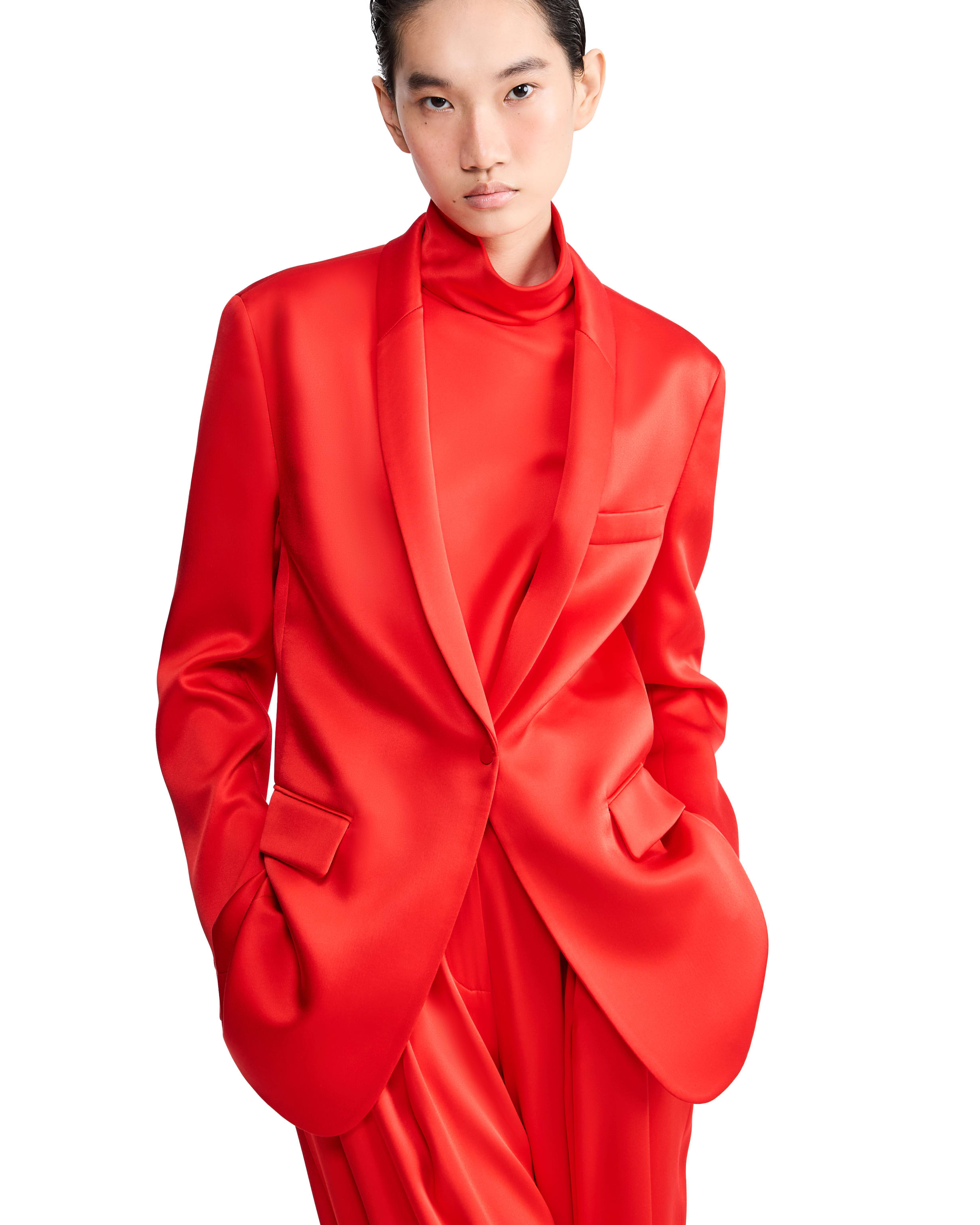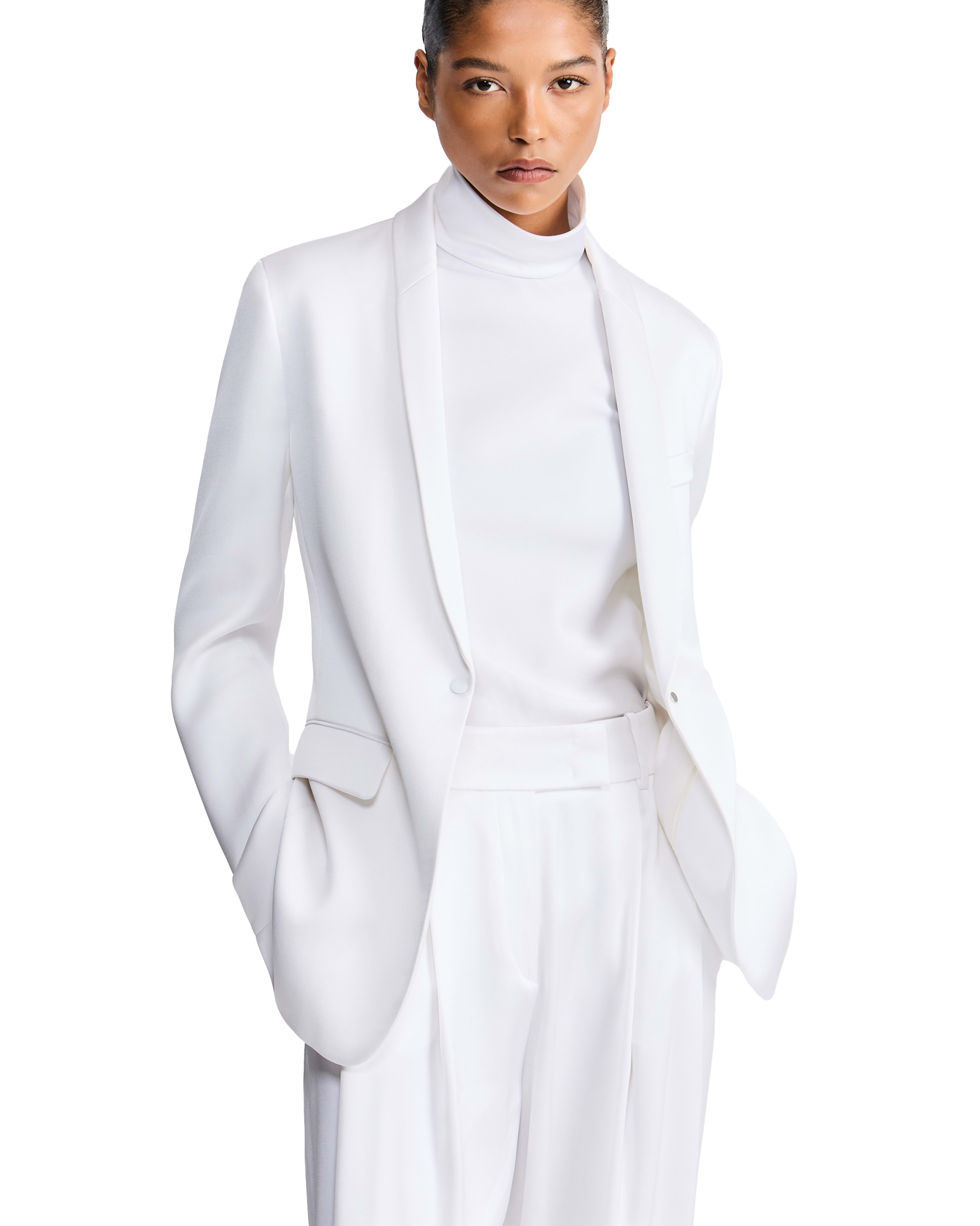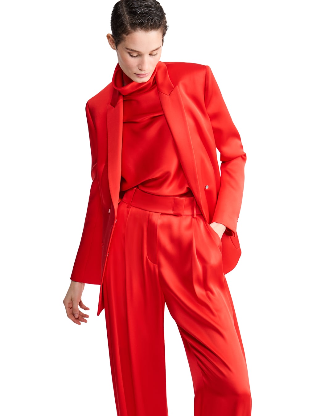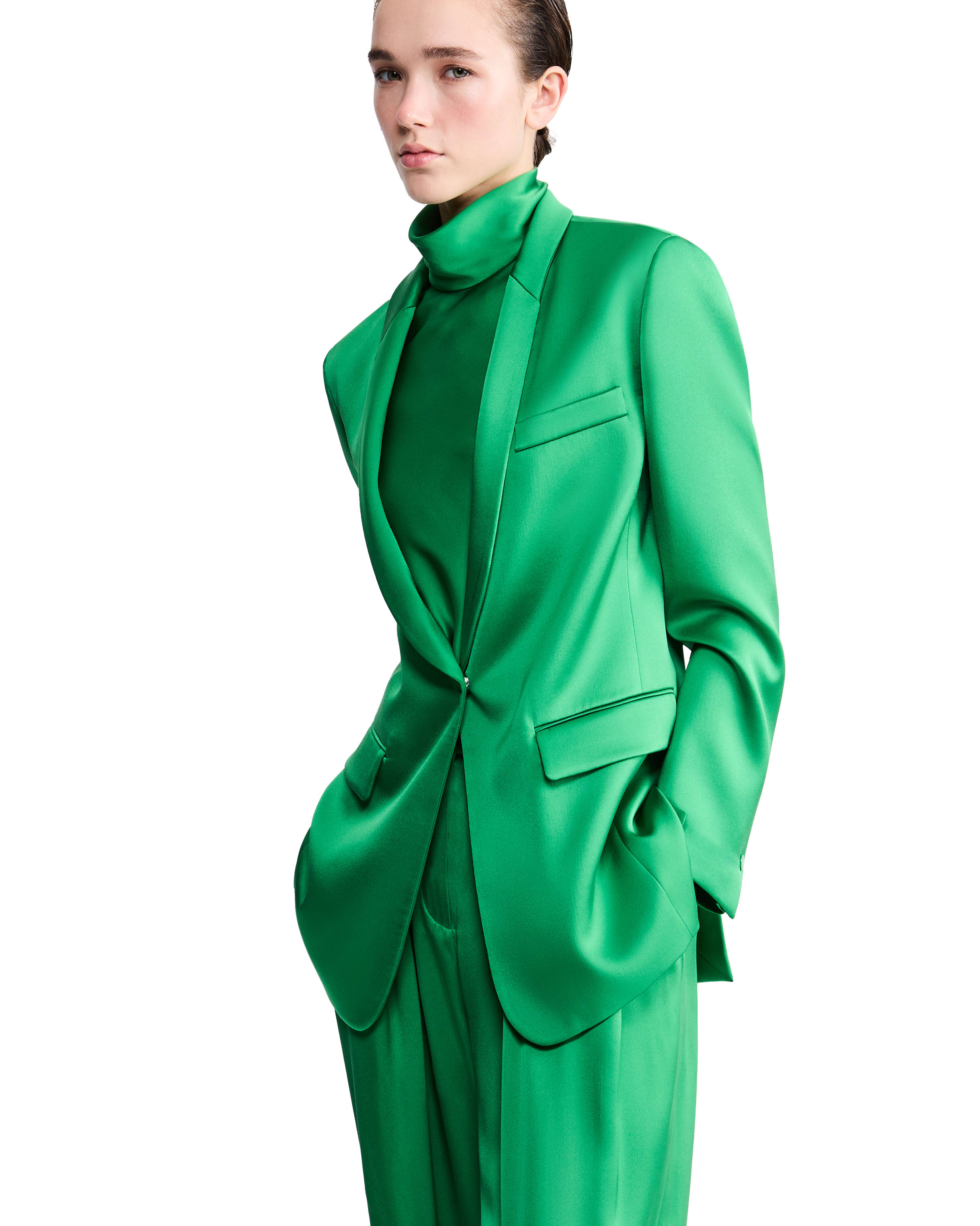 Due proposte eleganti realizzate in pura seta: una in versione doppiopetto, l’altra monopetto, entrambe abbinate a un top a collo alto che avvolge ed esalta la silhouette, mentre i pantaloni dalla linea fluida completano con distinzione il look.