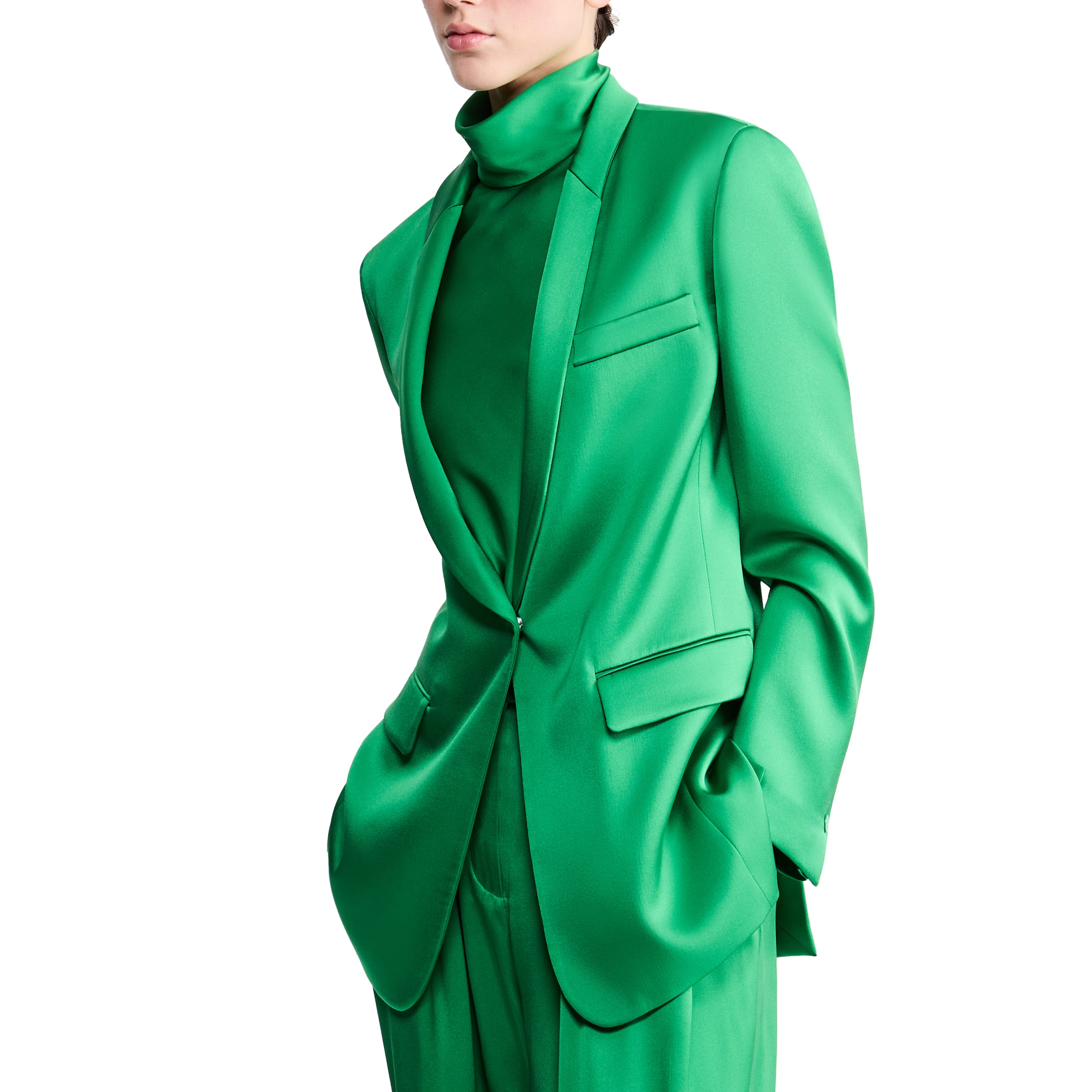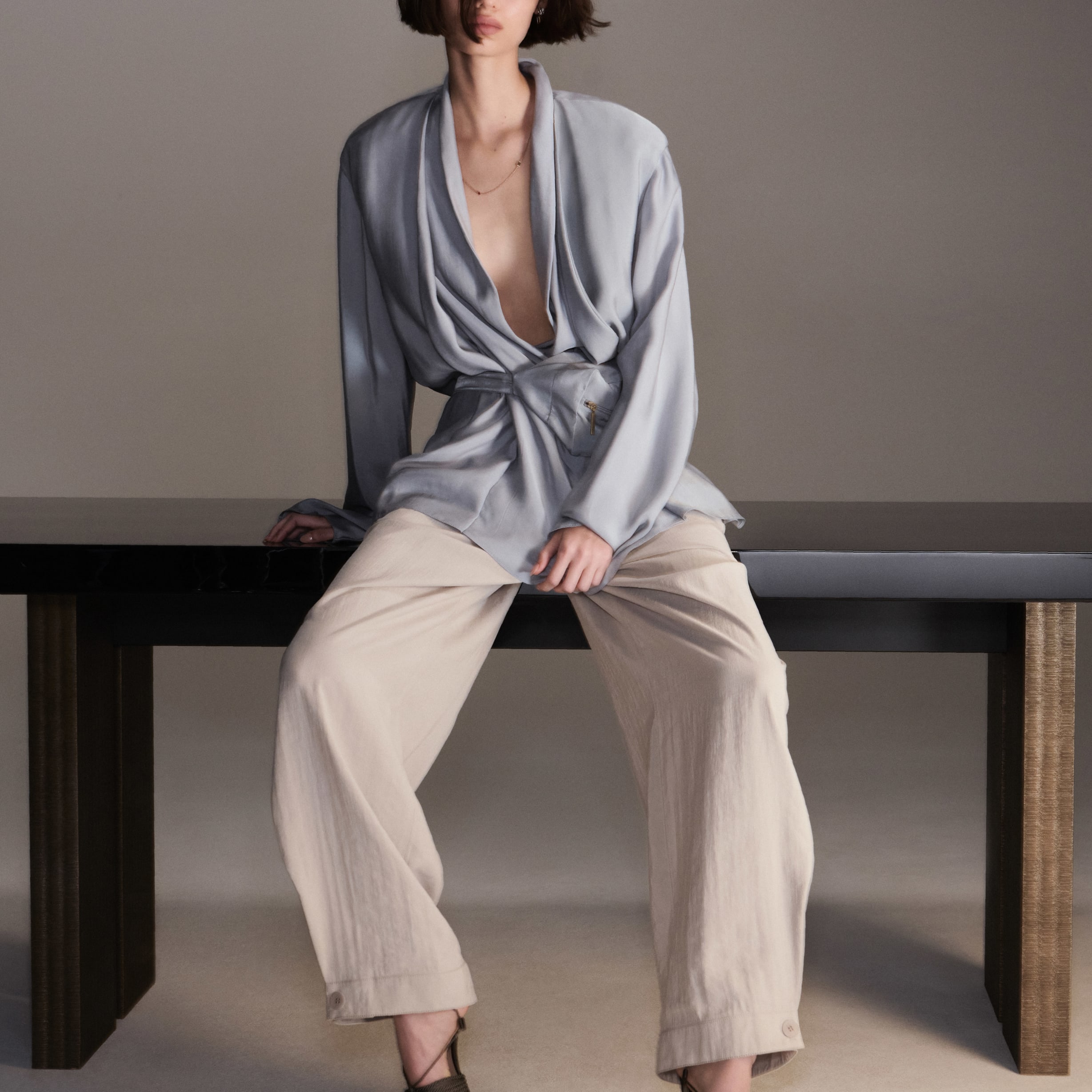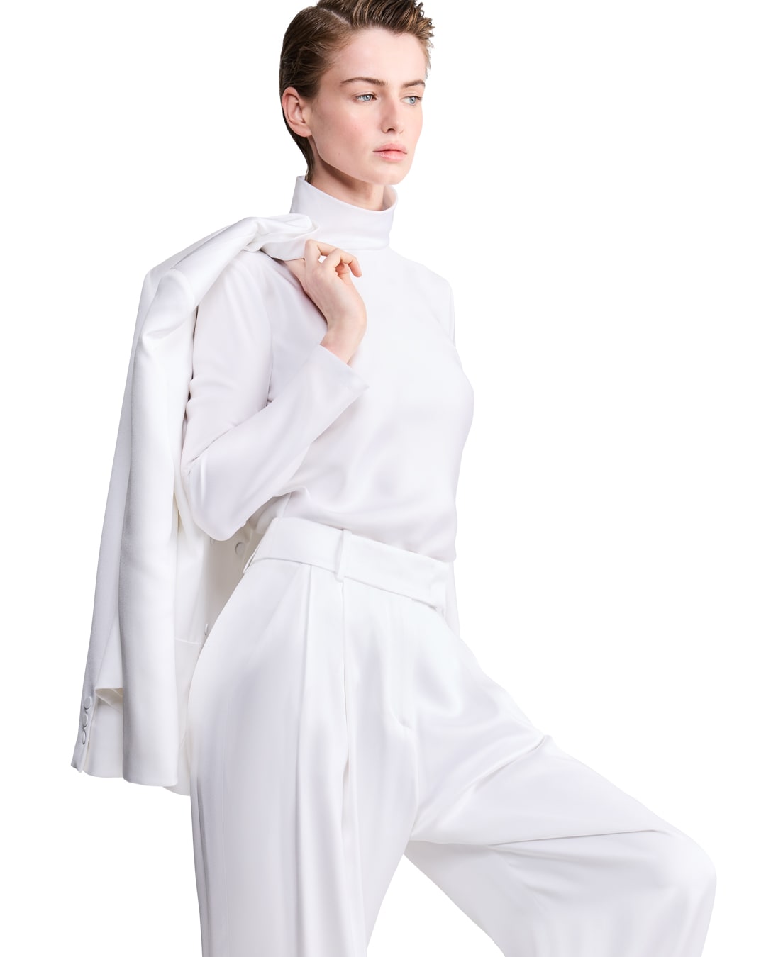 Due proposte eleganti realizzate in pura seta: una in versione doppiopetto, l’altra monopetto, entrambe abbinate a un top a collo alto che avvolge ed esalta la silhouette, mentre i pantaloni dalla linea fluida completano con distinzione il look.