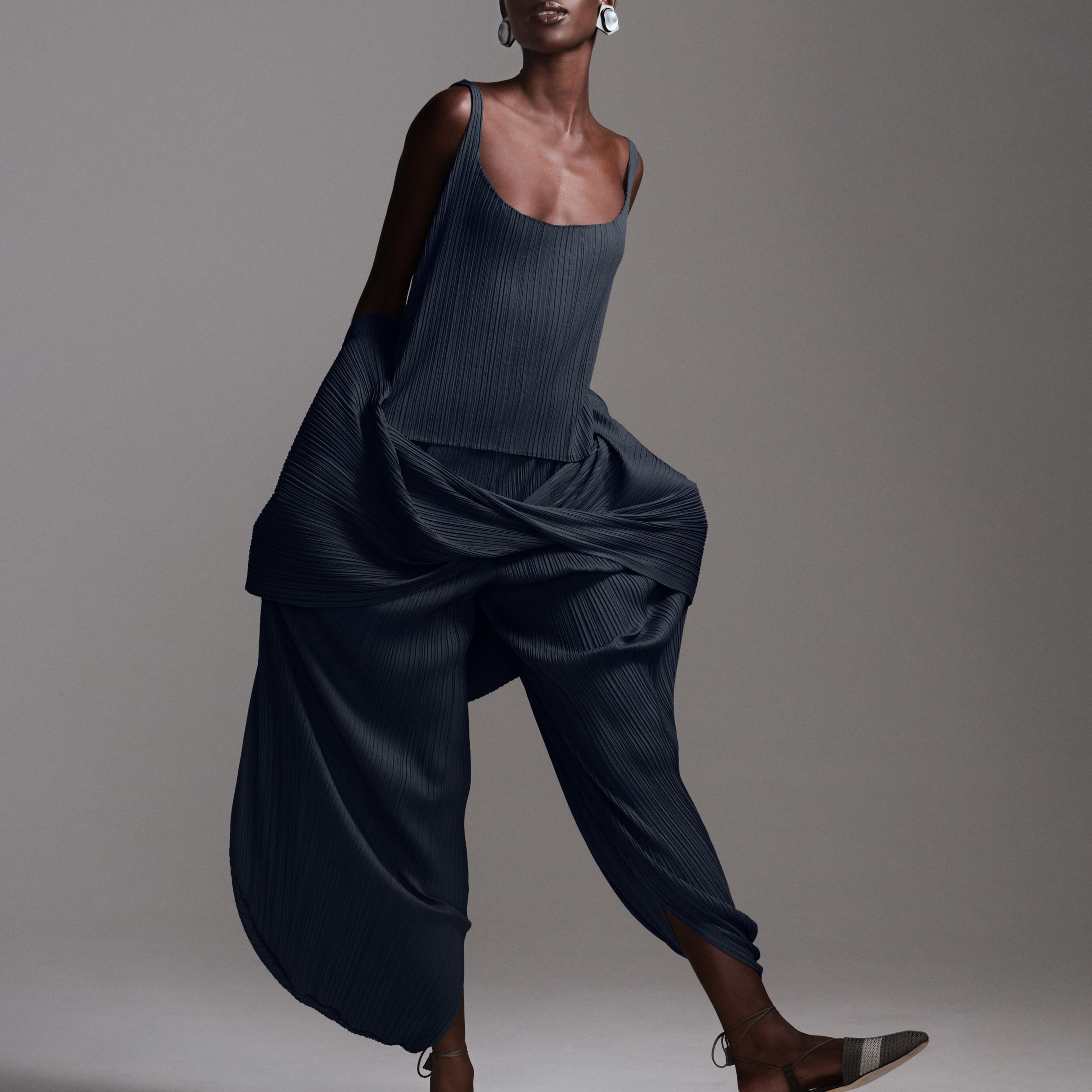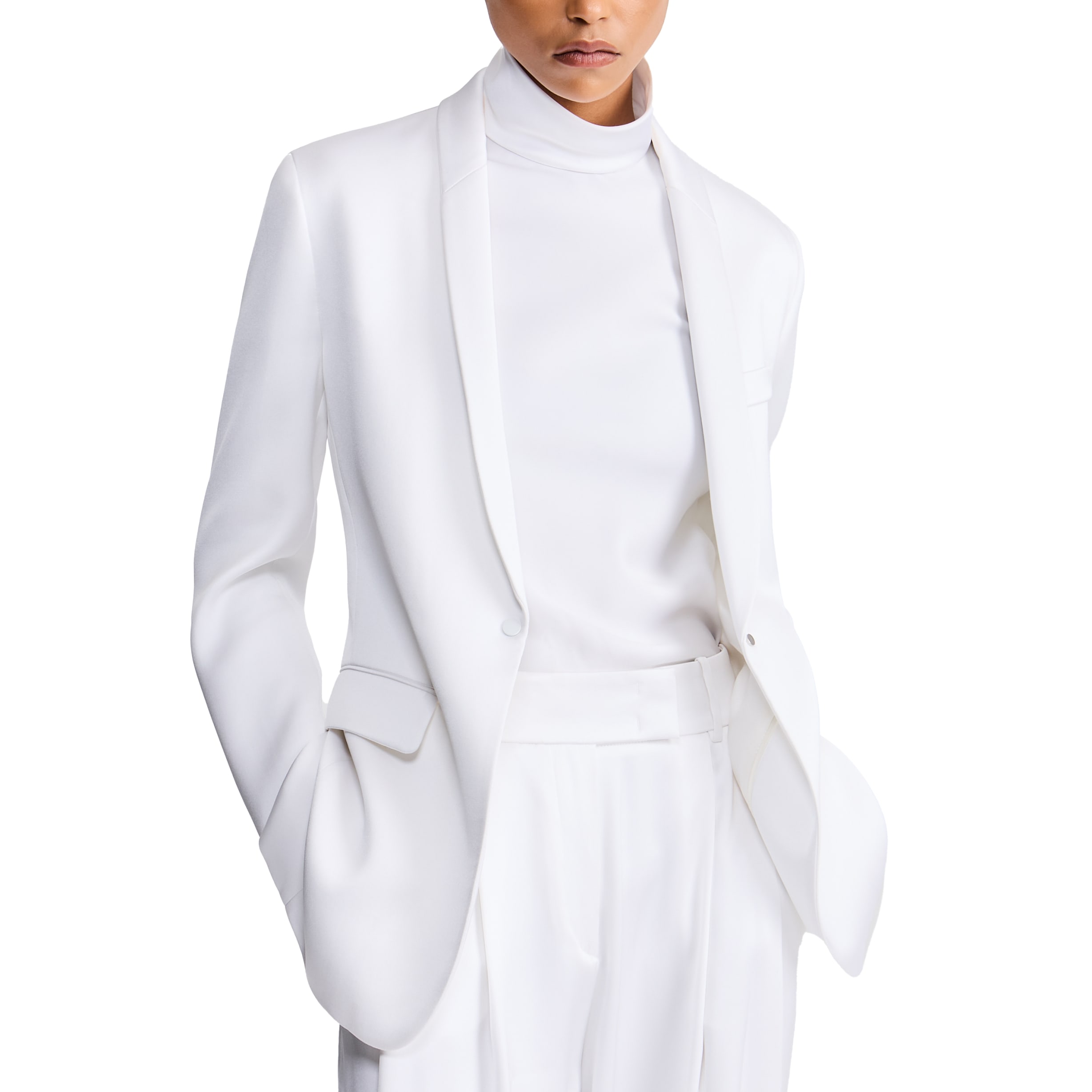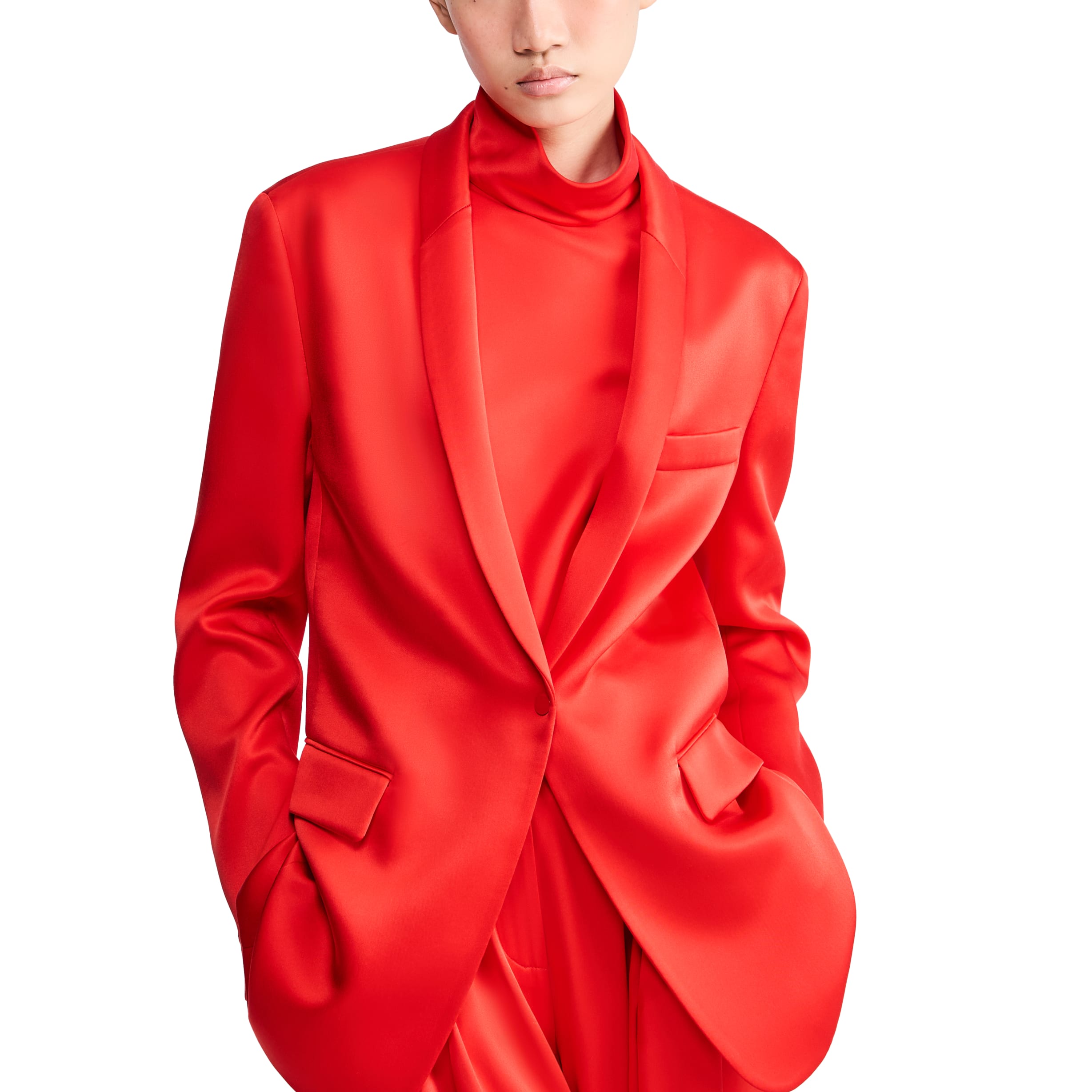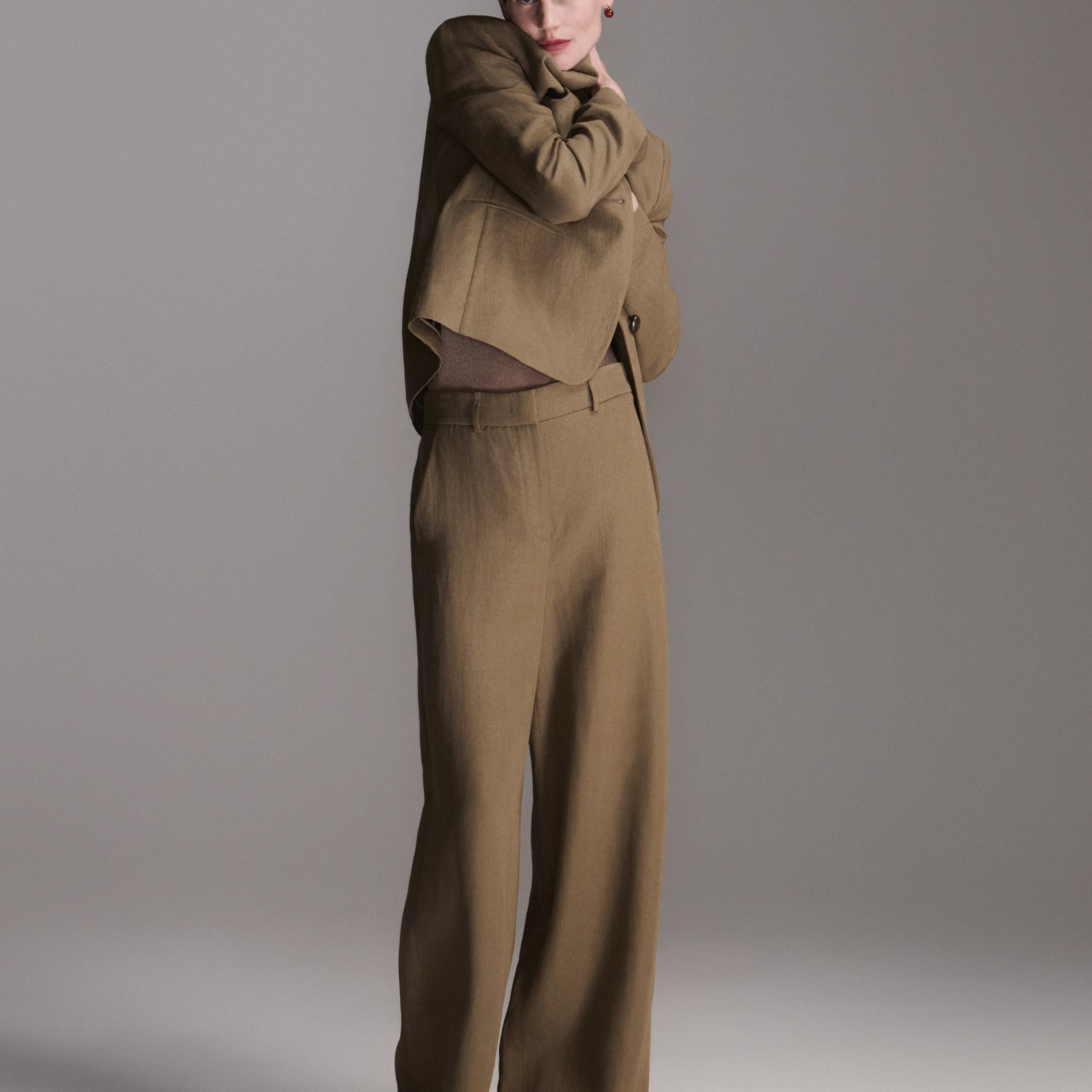 Due proposte eleganti realizzate in pura seta: una in versione doppiopetto, l’altra monopetto, entrambe abbinate a un top a collo alto che avvolge ed esalta la silhouette, mentre i pantaloni dalla linea fluida completano con distinzione il look.